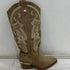 These cowboy boots feature beige suede with sparkling gold embellishments.